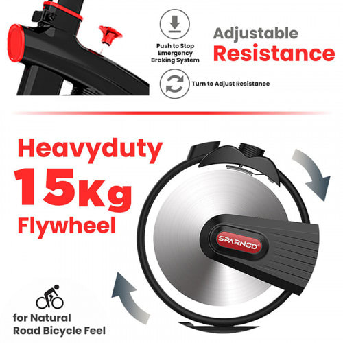 SSB-15 Heavy Duty 15Kg Flywheel Spin Bike. This flywheel spin bike is perfect for fitness enthusiasts who want a smooth, jerk-free pedaling motion like riding a bicycle outdoors. The belt-driven system provides a smoother and quieter ride, while the heavy-duty triangular frame ensures stability and durability. Plus, the 1-year Warranty.