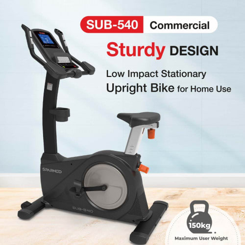 The SUB-540 Commercial Upright Bike is a top of the line, commercial grade bike. It features a self-generator electromagnetic control flywheel that allows for a maximum user weight of 150 kg, 24 resistance levels, and 12 preset programs. It also features a 7" LCD display, console functions, and connectivity to an mp3 player and USB. The bike has a weight of 50 kg and a size of 123.7 cm x 62.5 cm x 147.5 cm, making it perfect for use in commercial settings or at home.